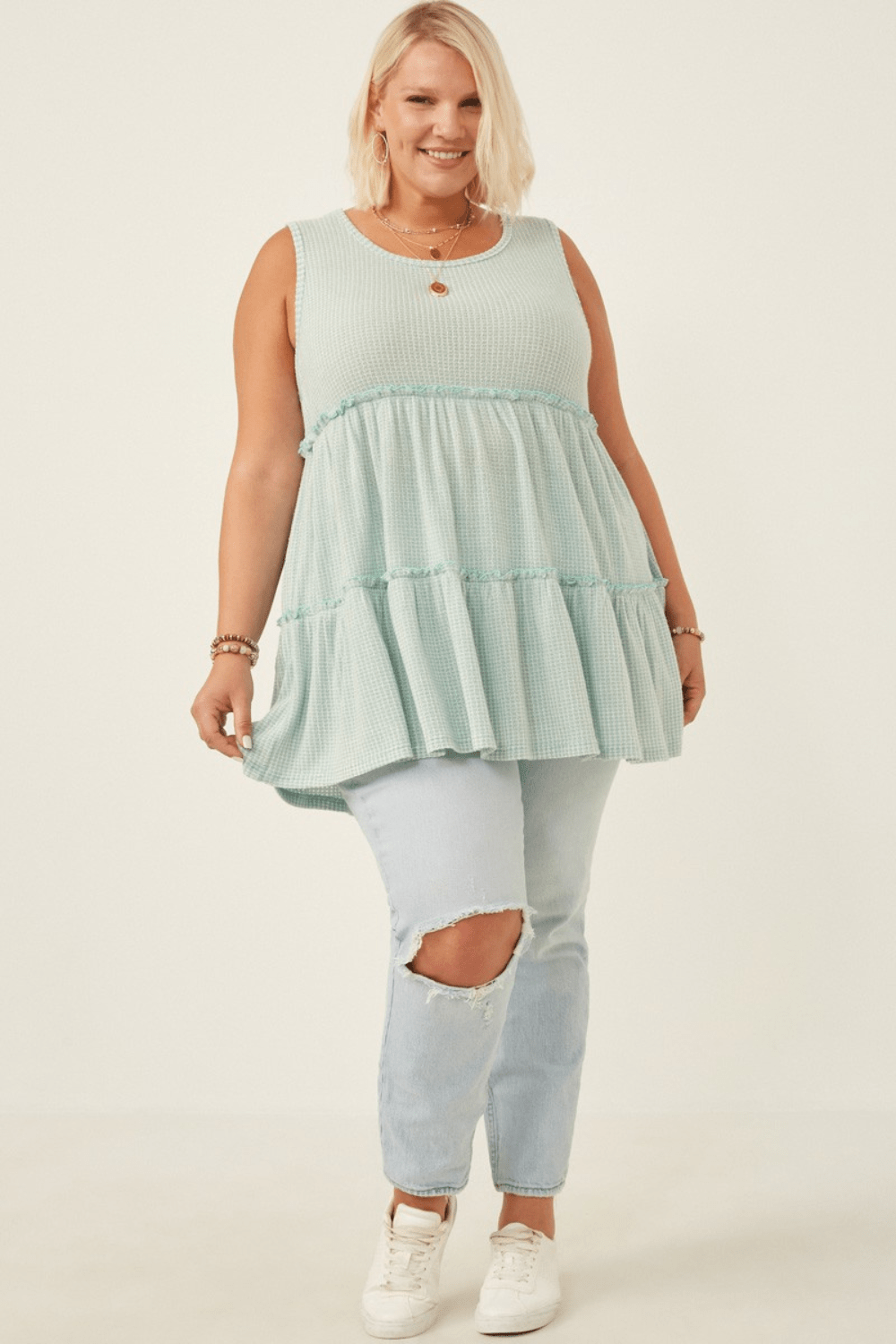 Meet your new warm-weather fave: the Gwen Waffle Knit Babydoll Tank in Sage. This easygoing sleeveless top features a soft waffle knit texture, a flattering babydoll silhouette, and a breezy fit that’s perfect for sunny days. The sage green hue adds a fresh pop of color, while the flowy shape makes it a dream to pair with denim shorts or your favorite jeans. Cute, comfy, and effortlessly stylish—Gwen’s got you covered from coffee runs to weekend strolls.